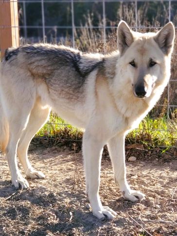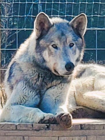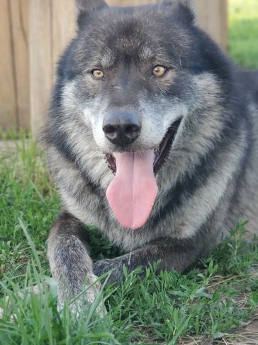 Manny came to us under pretty unfair conditions. He was in an illegal state and thought to be a GSD mix...found out wolf was the mix so had to find a new home to keep him safe. He is a big goofy, loving boy who fit right in with us here! We recently lost Manny to a twisted stomach, which can happen in big chested dogs. He will be missed terribly by everyone who knew him.